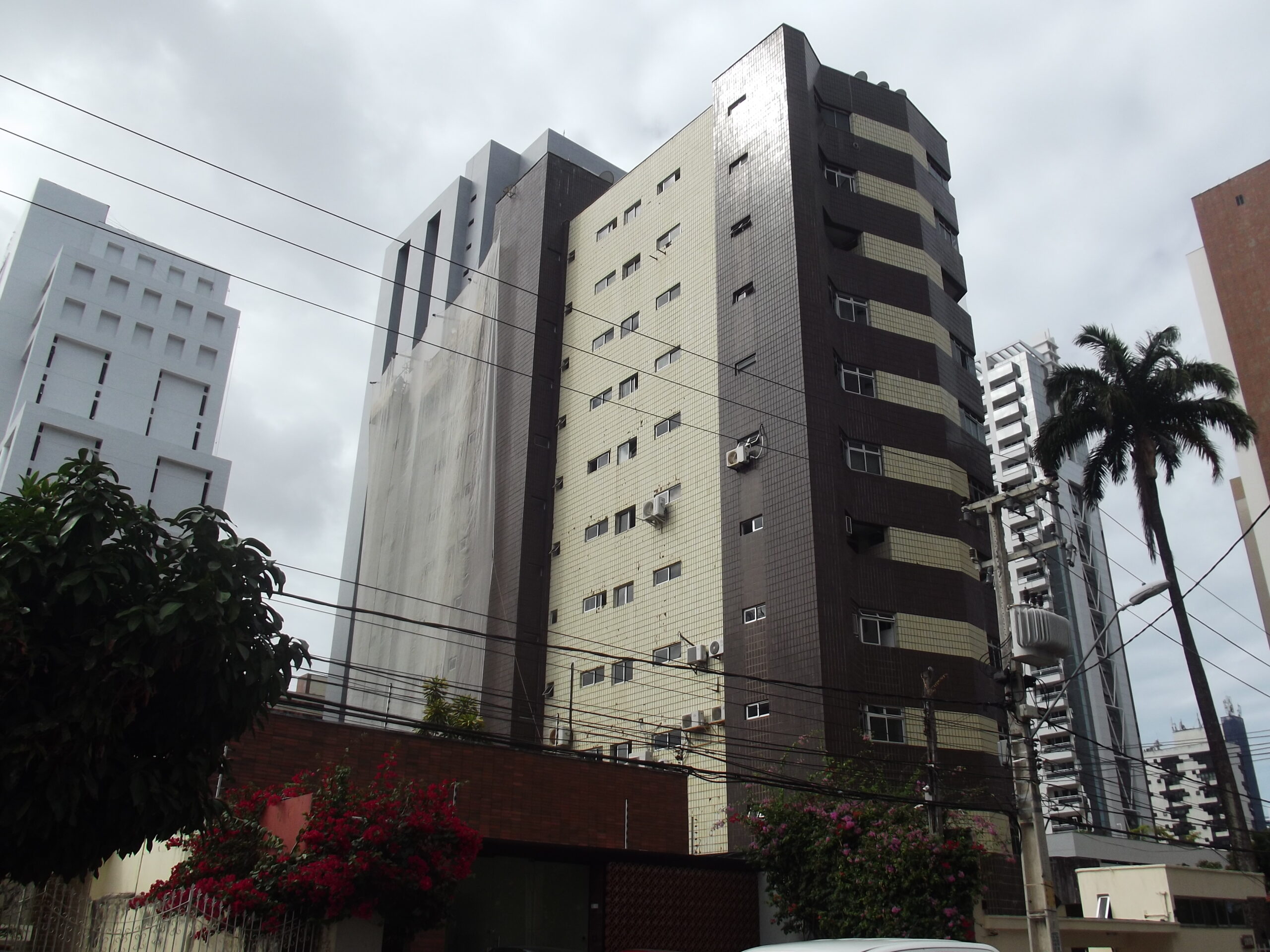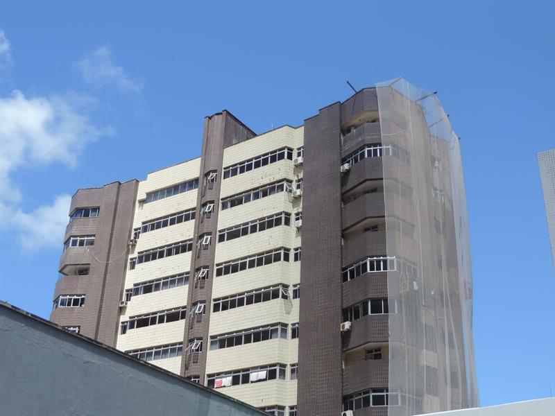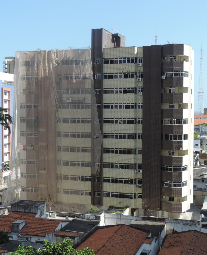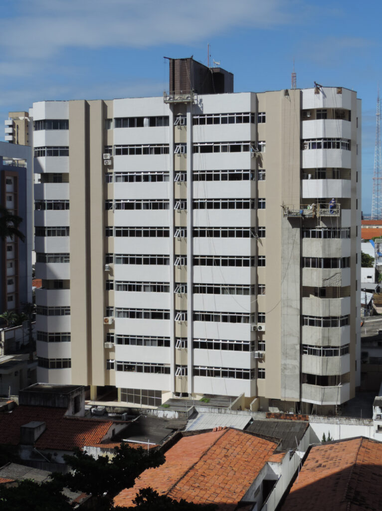 Dessa forma, foram realizadas as devidas demolições dos antigos revestimentos cerâmicos, regularizado o emboço existente com argamassa AC-III e aplicado o novo revestimento cerâmico, tanto em suas porções gerais como em porções lineares. Fez também parte desse serviço a execução de juntas de dilatação, rejuntamento do revestimento cerâmico e lavagem total das fachadas.