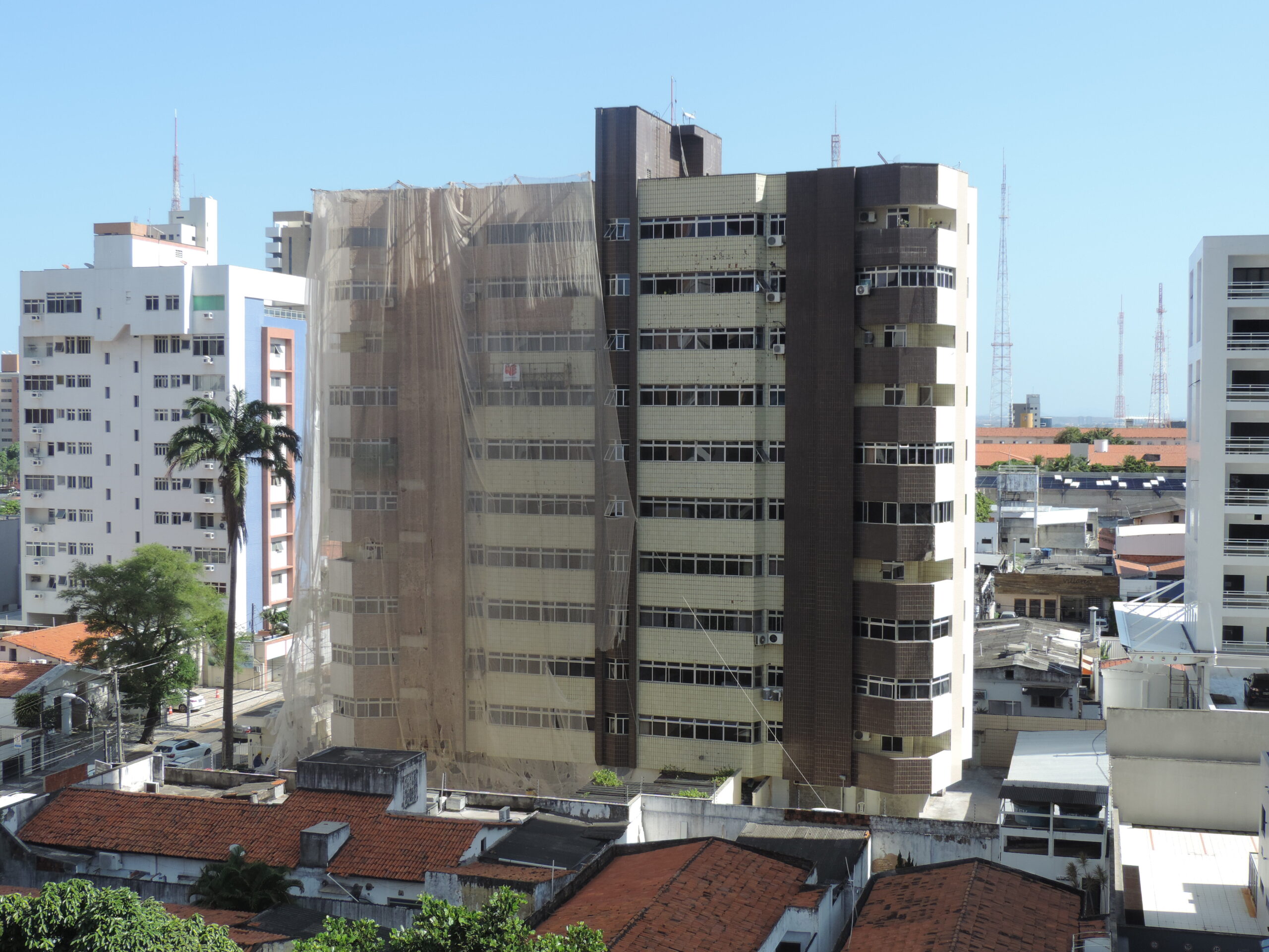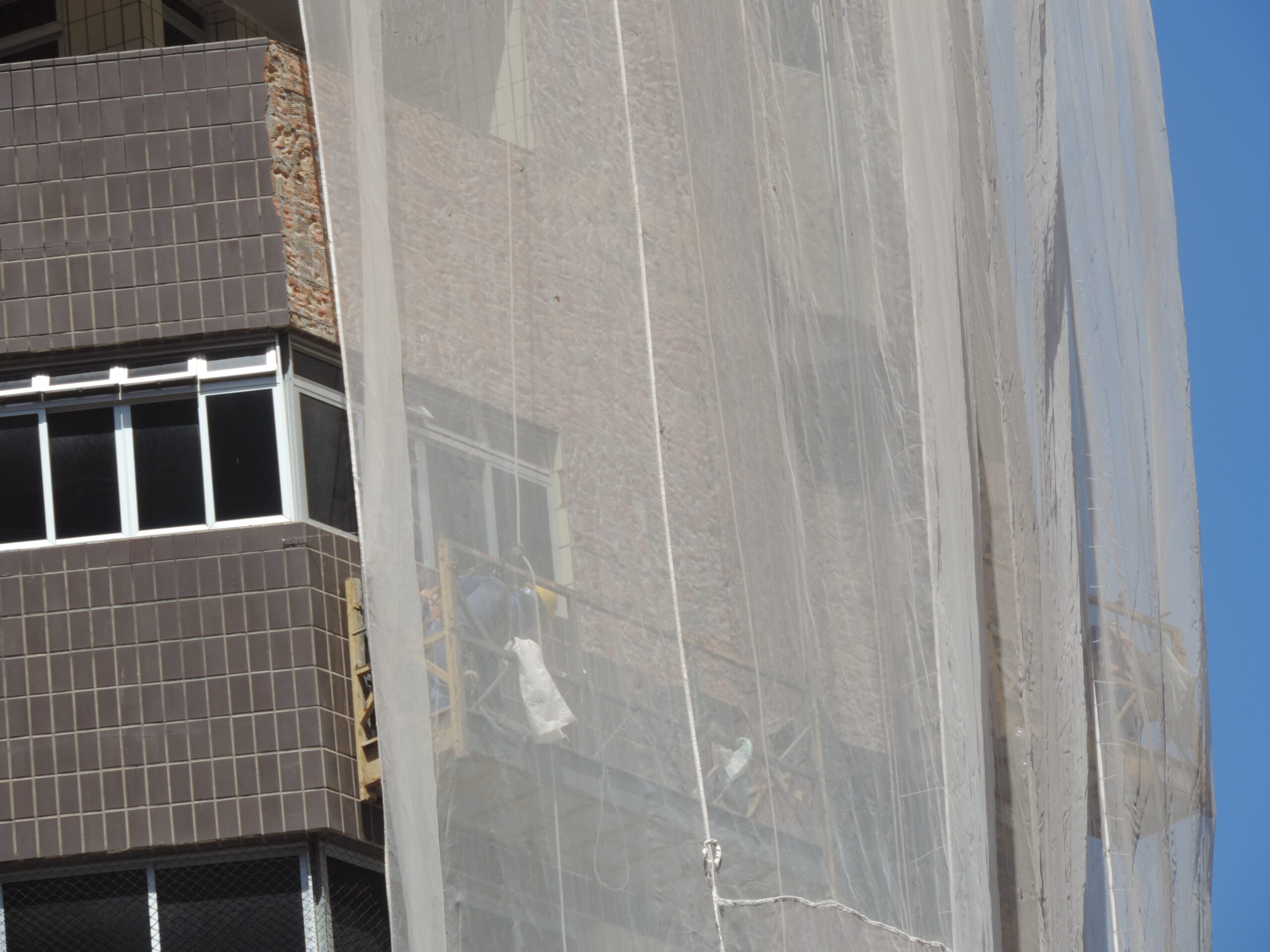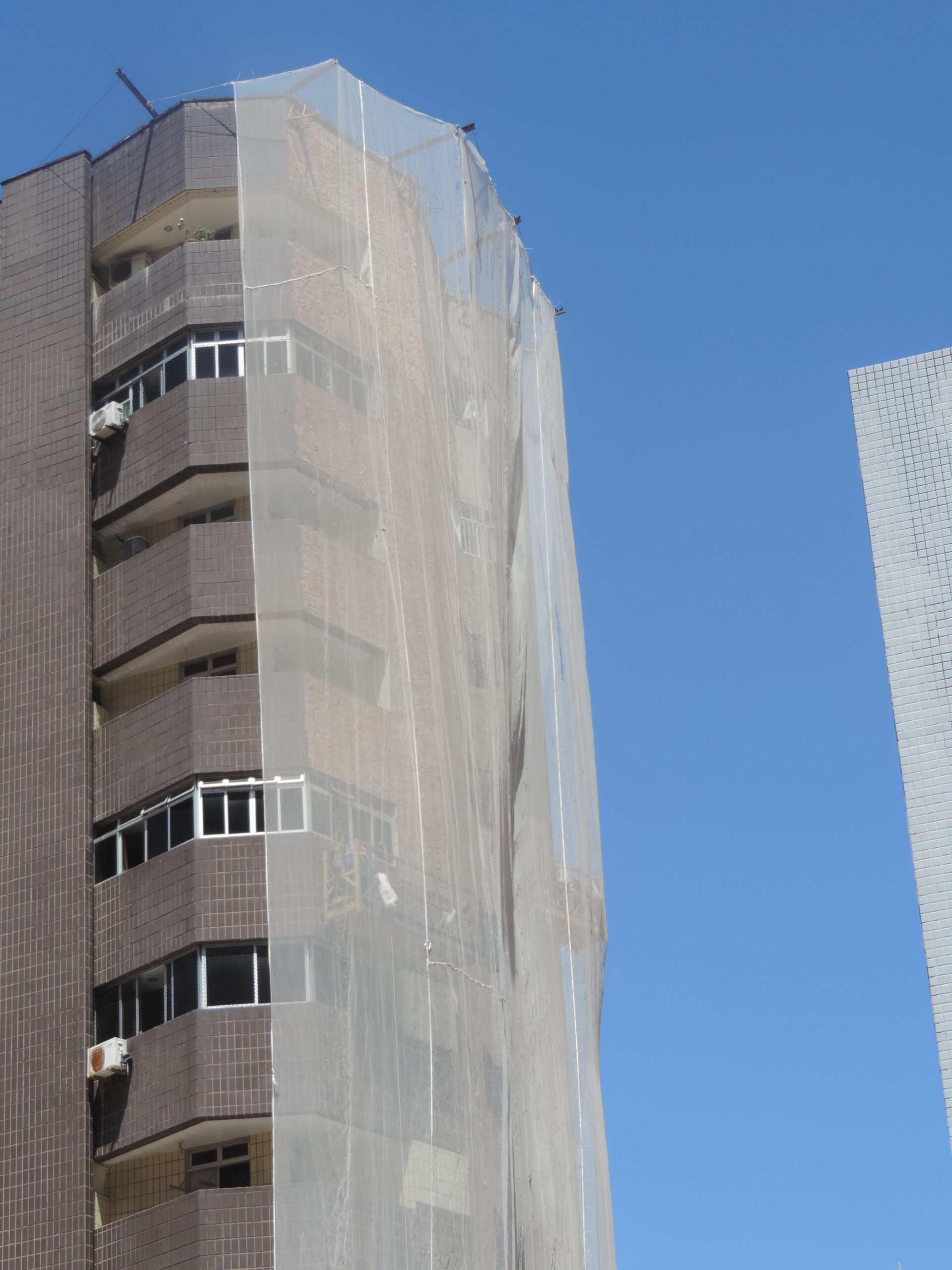 Dessa forma, foram realizadas as devidas demolições dos antigos revestimentos cerâmicos, regularizado o emboço existente com argamassa AC-III e aplicado o novo revestimento cerâmico, tanto em suas porções gerais como em porções lineares. Fez também parte desse serviço a execução de juntas de dilatação, rejuntamento do revestimento cerâmico e lavagem total das fachadas.