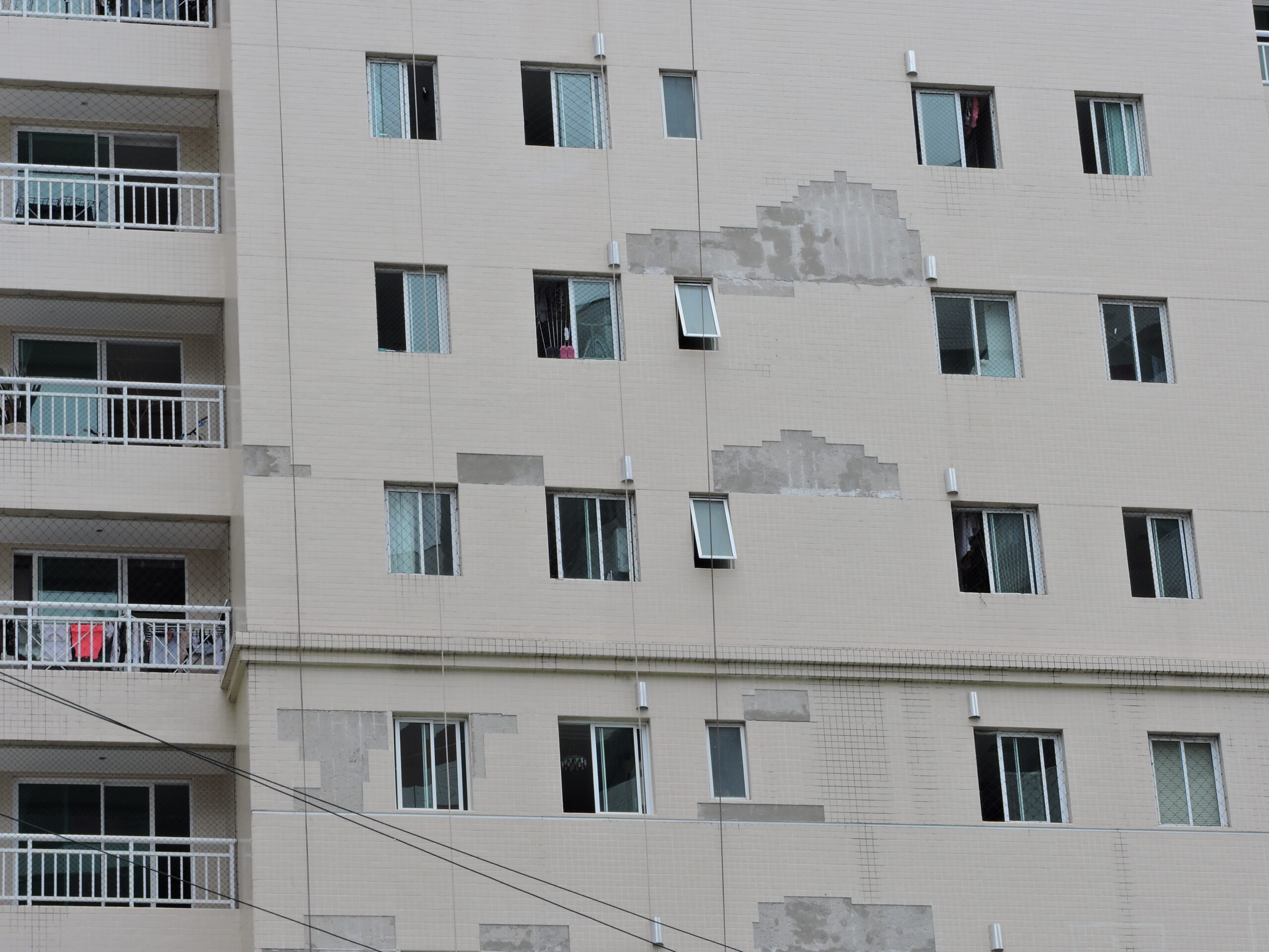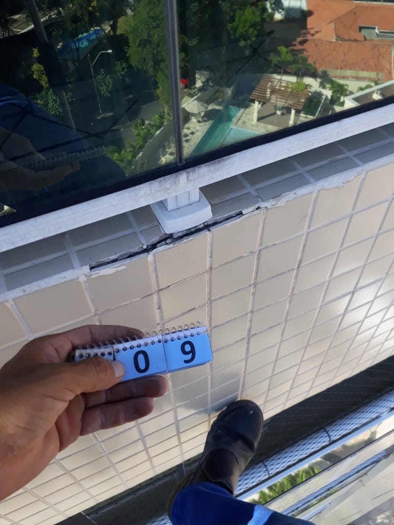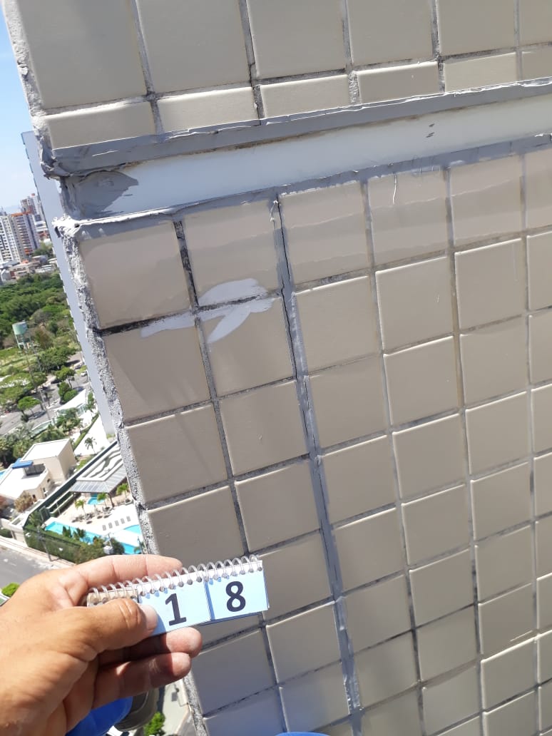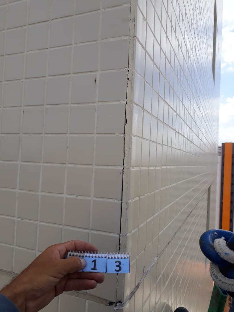 O Edifício Único celebrou contrato com a WE Engenharia para a realização de operação em Engenharia Diagnóstica, a fim de conhecer a situação de suas fachadas por meio de relatório técnico. O ensaio percussivo, a inspeção de juntas e a vistoria técnica dos componentes das fachadas constataram as seguintes ocorrências: revestimento cerâmico com som cavo e falhas de aderência; emboço com má aderência ao substrato; selante ressecado nas juntas de dilatação com fissuras; falhas em diversos pontos de rejunte, incluindo na transição com esquadrias, peitoris e elementos decorativos; aberturas em cantos externos causadas por falhas de vedação; fissuras no rejuntamento vertical; desplacamento do revestimento cerâmico em áreas com instalação de guarda-corpo e ganchos de rede de proteção; placas cerâmicas quebradas com aberturas; fissura longitudinal na viga da varanda com risco de desplacamento; danos causados por instalação inadequada de ganchos e ausência de vedação nos mesmos; além de preenchimento inadequado do ensaio de arrancamento com rejunte.