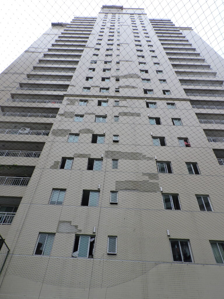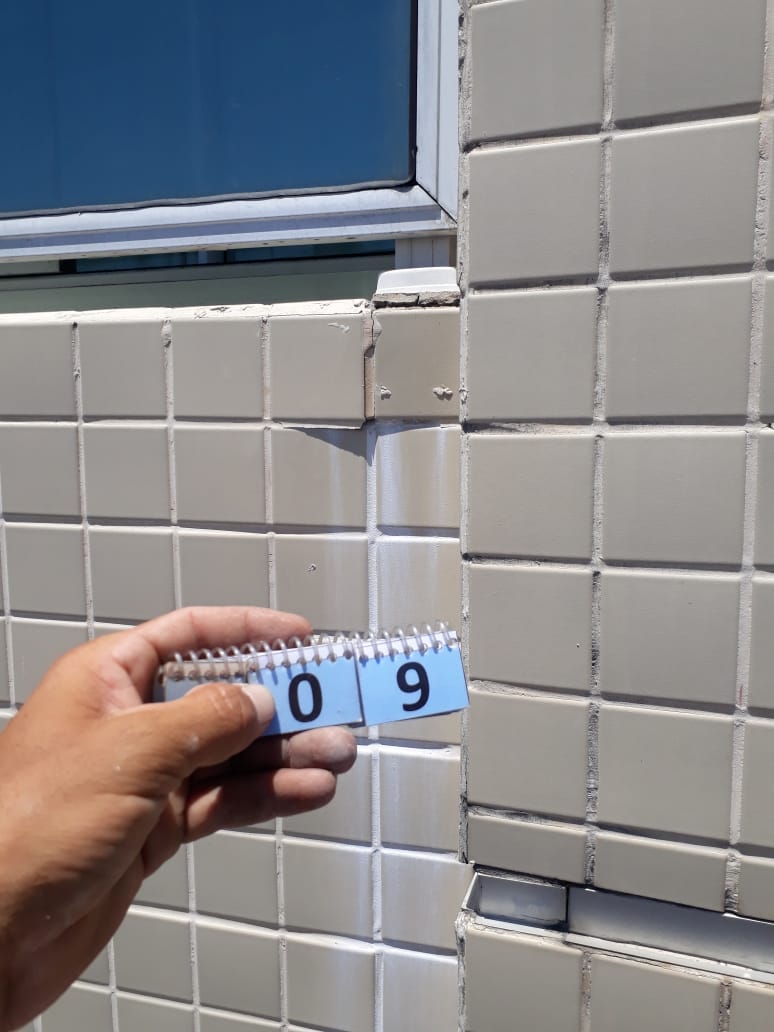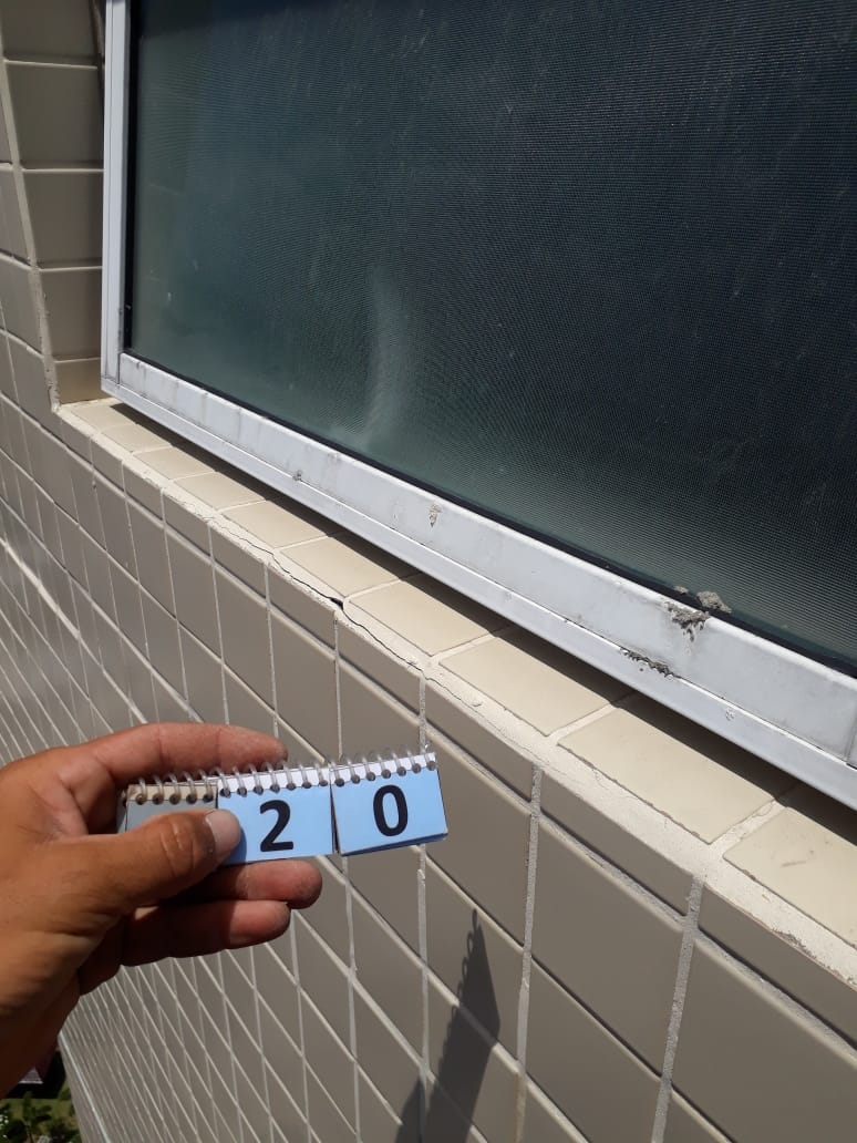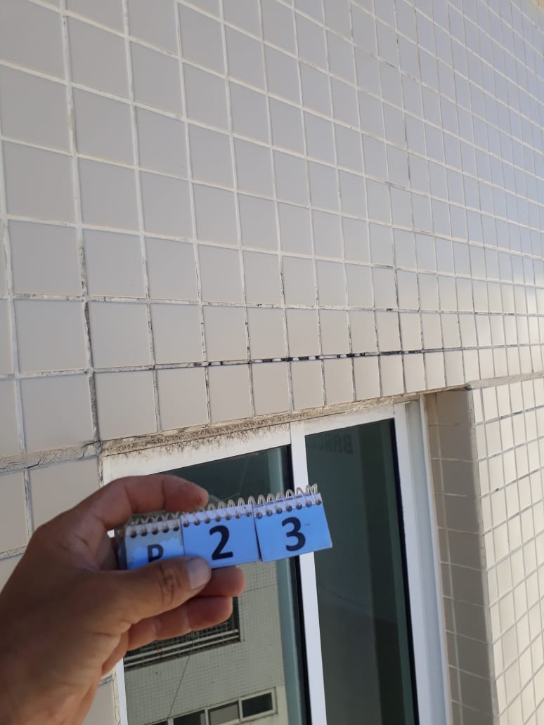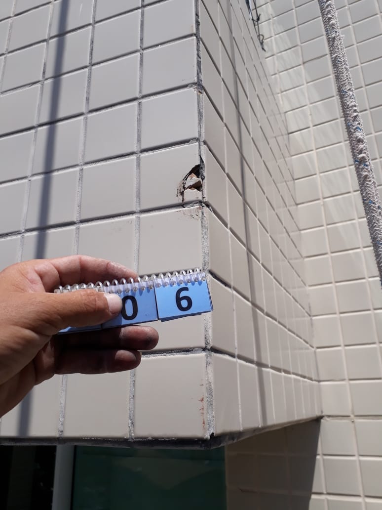 O Edifício Único celebrou contrato com a WE Engenharia para a realização de operação em Engenharia Diagnóstica, a fim de conhecer a situação de suas fachadas por meio de relatório técnico. O ensaio percussivo, a inspeção de juntas e a vistoria técnica dos componentes das fachadas constataram as seguintes ocorrências: revestimento cerâmico com som cavo e falhas de aderência; emboço com má aderência ao substrato; selante ressecado nas juntas de dilatação com fissuras; falhas em diversos pontos de rejunte, incluindo na transição com esquadrias, peitoris e elementos decorativos; aberturas em cantos externos causadas por falhas de vedação; fissuras no rejuntamento vertical; desplacamento do revestimento cerâmico em áreas com instalação de guarda-corpo e ganchos de rede de proteção; placas cerâmicas quebradas com aberturas; fissura longitudinal na viga da varanda com risco de desplacamento; danos causados por instalação inadequada de ganchos e ausência de vedação nos mesmos; além de preenchimento inadequado do ensaio de arrancamento com rejunte.
