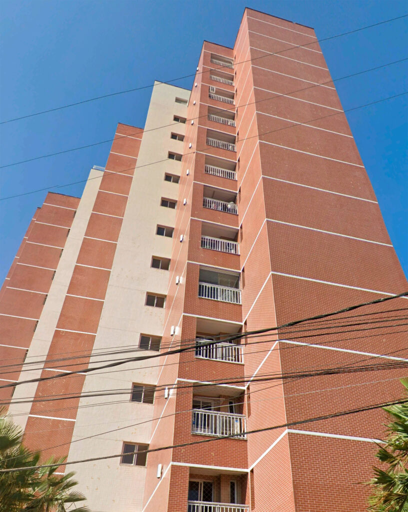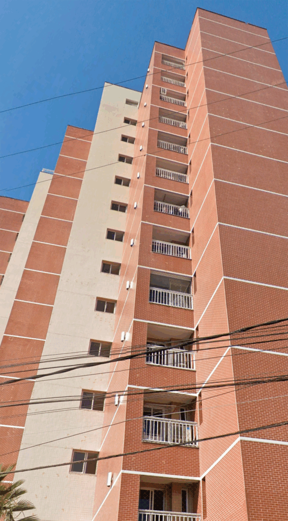 O condomínio Marzzano Premium Residence celebrou contrato com a WE Engenharia para a realização de operação em Engenharia Diagnóstica, a fim de conhecer a situação de suas fachadas por meio de relatório técnico. O ensaio percussivo, a inspeção de juntas e a vistoria técnica dos componentes das fachadas constataram as seguintes ocorrências: revestimento com presença de som cavo, evidenciando possíveis falhas em sua aderência; possível falha na aderência do emboço ao substrato, o que pode ocasionar o seu desplacamento do substrato; cerâmicas fissuradas e quebradas na fachada; eflorescência no revestimento e rejunte; falha no rejunte; fachada fissurada; revestimento danificado por gancho de rede de proteção; ausência de vedação nos ganchos de fixação das redes de proteção; selante da junta de dilatação desgastado pela ação do tempo, apresentando fissuras, ressecamento, aberturas e descolamento do revestimento; falha no rejunte entre os porcelanatos; presença de sujidades no revestimento da fachada, possivelmente tinta branca; falha na vedação da esquadria;